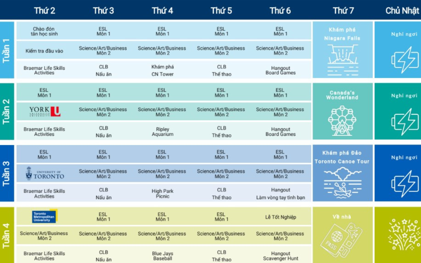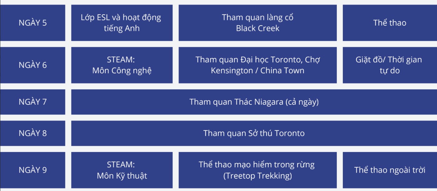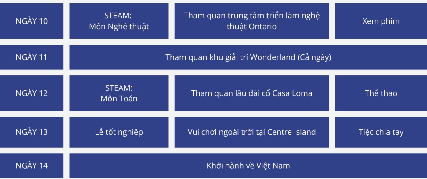 - Trải nghiệm môi trường học tập Đại học & Cao đẳng: Học sinh tham quan các trường Đại học hàng đầu như Đại học Toronto, Đại học TMU, Đại học OCAD, Đại học Queen’s, tìm hiểu đời sống sinh viên, văn hóa học thuật và định hướng nghề nghiệp cho tương lai.