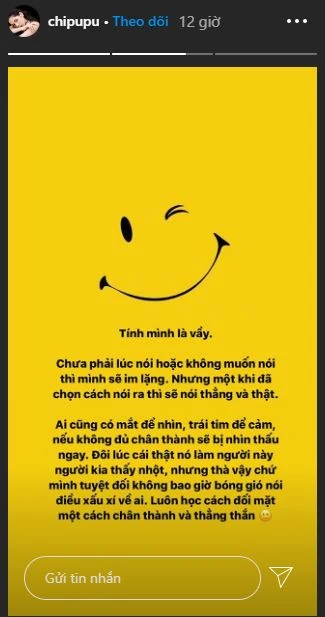 Thêm vào đó, Chi Pu cũng mập mờ “đá xéo” ai đó qua story Instagram với bức tâm thư dài vào tối 19-5. Trong đó cô cho biết bởi vì tính tình thẳng thắn nên không bao giờ nói bóng gió xấu xí về ai.