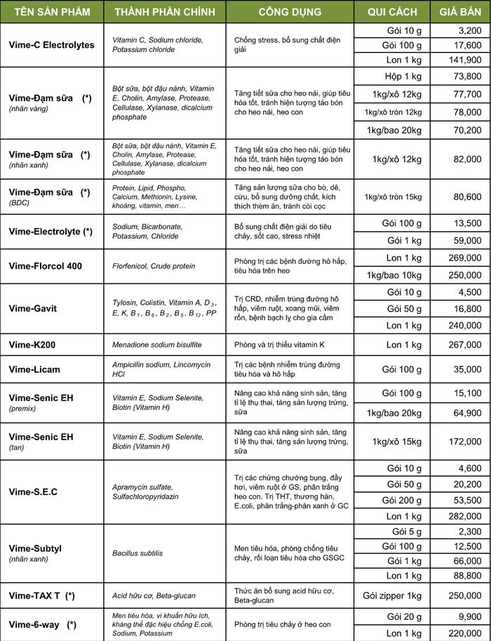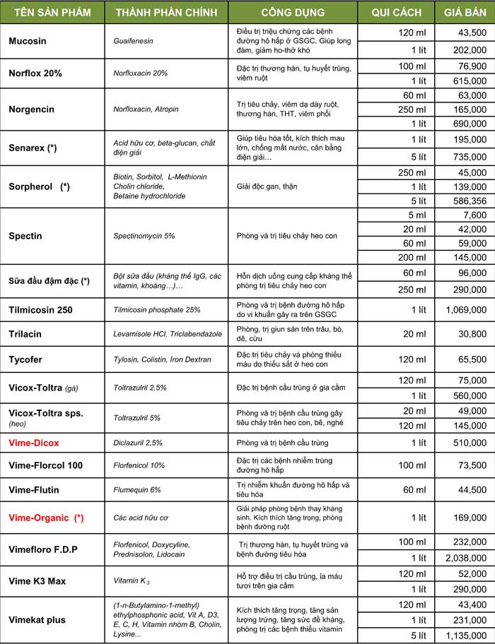 Công ty Vemedim được thành lập vào năm 1992 tại Cần Thơ, công ty chuyên về sản xuất, kinh doanh và xuất nhập khẩu các vật tư ngành thú y đạt tiêu chuẩn quốc tế. Sản phẩm của Vemedim được phân phối và tiêu thụ trên toàn quốc và hơn 42 nước trên thế giới. Với đội ngũ nhân viên chuyên nghiệp nhiều kinh nghiệm, hệ thống nhà máy đạt tiêu chuẩn GMP, hệ thống kho hàng đạt chuẩn GSP, ....sản phẩm của công ty Vemedim đã được bà con chăn nuôi tin yêu sử dụng. Sau đây là chi tiết bảng giá và công dụng của tất cả các sản phẩm của công ty dược Vemedim. Đây là bảng giá mới nhất, tính đến 31 - 07 - 2020. Kính mời bà con tham khảo phần 2.