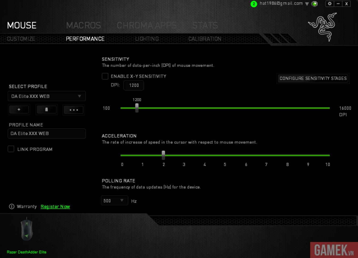 Mục Mouse >>> Performance có 2 option chính dùng để tinh chỉnh gia tốc và mức DPI của chuột, ở đây người viết đang chỉnh lại ở chế độ 1200 DPI và mức gia tốc là 2.