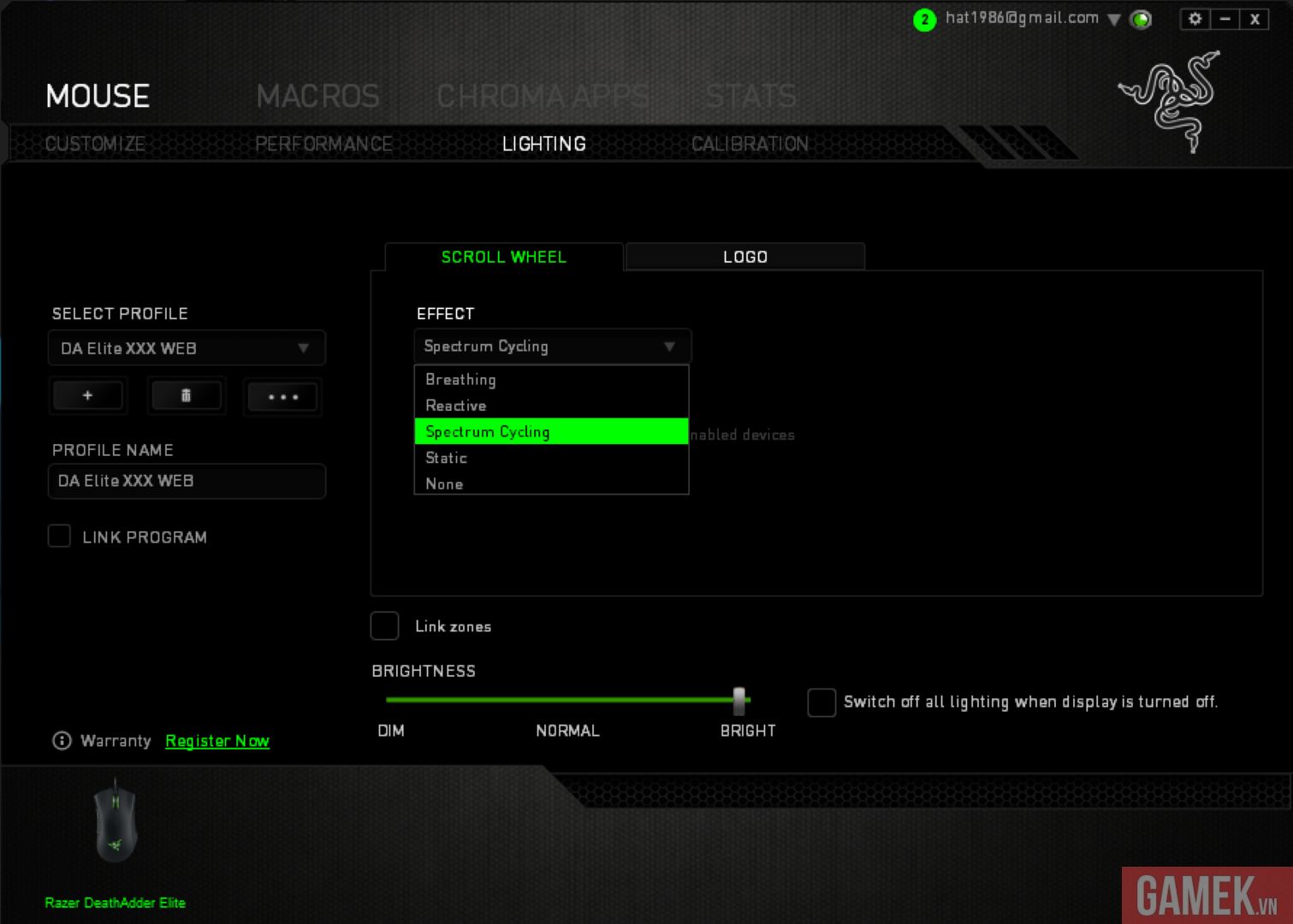 Mục Mouse >>> Lightning cho các lựa chọn về điều chỉnh ánh sáng LED Chroma trên scroll và logo Razer trên lưng chuột, vẫn với những chế độ Breathing, Reactive, Spectrum Cycling và Static quen thuộc trên các dòng sản phẩm có LED Chroma của Razer.