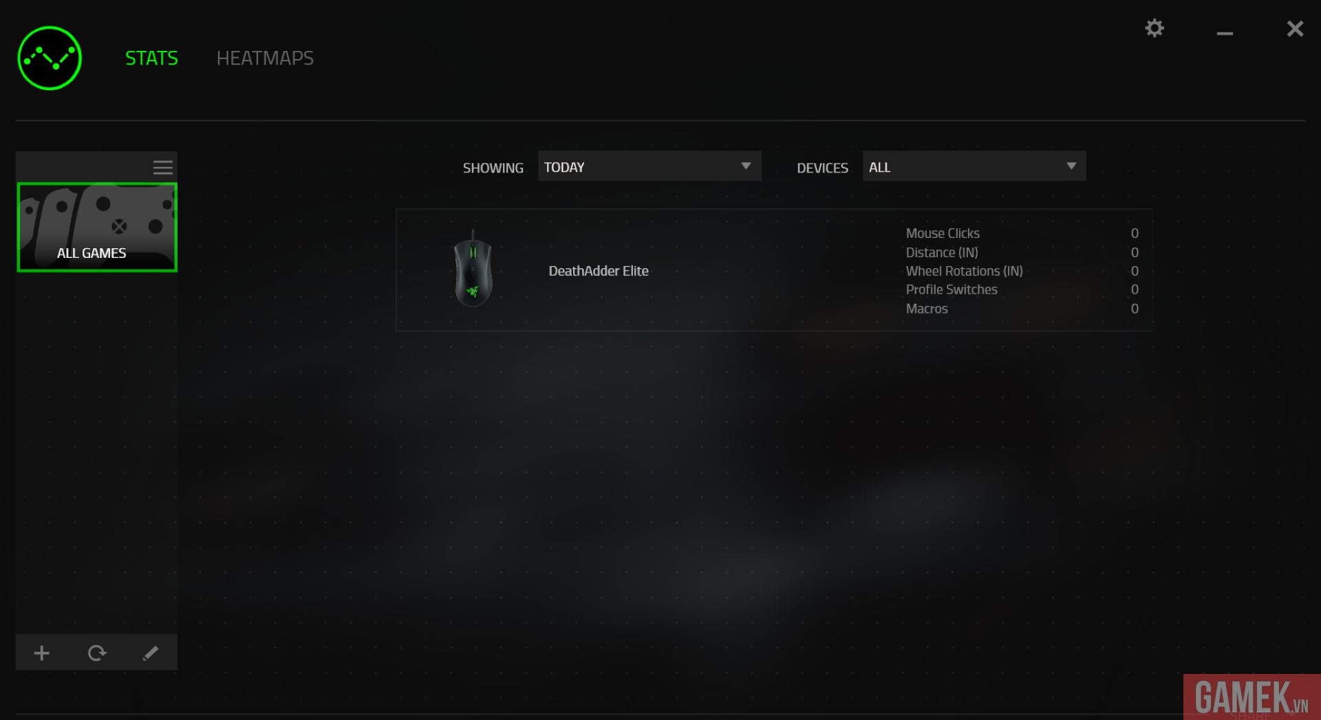 Cuối cùng, tại mục STAT (Status), đây là nơi Synapse cập nhật liên tục các thông tin và thông số sử dụng của các sản phẩm Razer đang kết nối tới Synapse. Ví dụ cụ thể ở đây là chú chuột Razer Deathadder Elite, nhìn sang bảng thông số ở góc bên phải, người dùng có thể thấy rõ các hạng mục được liệt kê như Mouse clicks (số lần đã click chuột), Distance (khoảng cách đã di chuột), Wheel rotation ( khoảng cách đã sử dụng nút scroll), Profile switches ( số profile đã chuyển đổi), Macros (số macro đã sử dụng)... Phần này thực ra là rất hữu dụng trong thực tế, khi mà bạn có thể check chi tiết thông số sử dụng của chuột cũng như các sản phẩm của Razer thông qua phần mềm này.