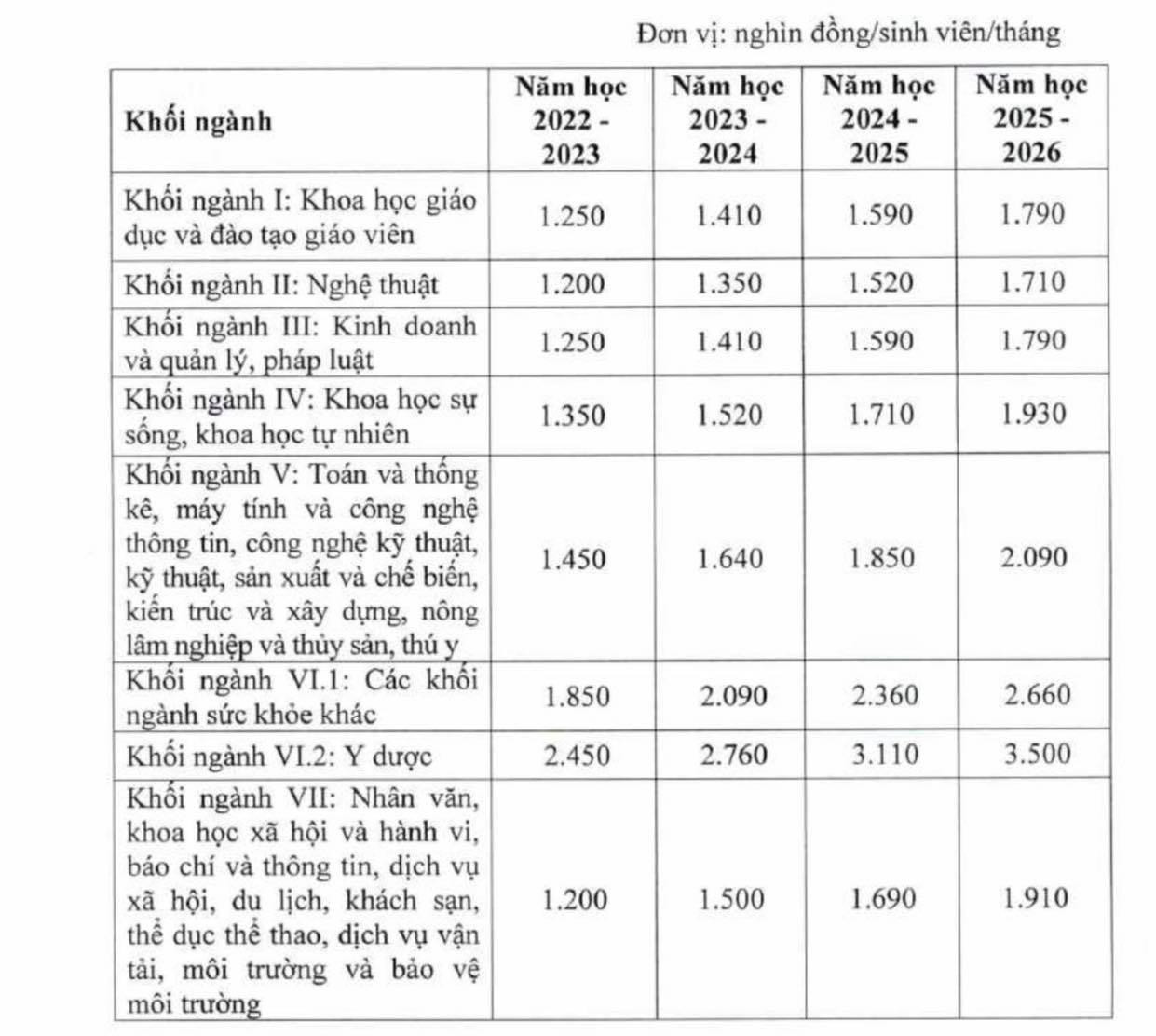 Đối với các cơ sở giáo dục ĐH công lập chưa tự đảm bảo chi thường xuyên (tự chủ), mức thu năm học 2022 - 2023 cao nhất là 2.450.000đ/sinh viên/tháng ở khối ngành VI (Y dược), mức hiện tại là 1.430.000đ/sinh viên, tăng 71,3%. Đây cũng là khối ngành tăng học phí mạnh nhất trong VII khối ngành đào tạo. Mức thu học phí cụ thể như sau: