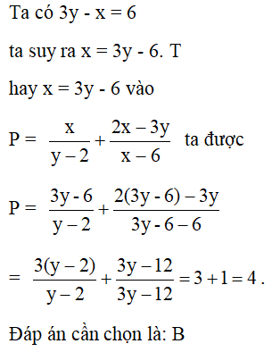 Cho 3y - x = 6. Tính giá trị của biểu thức P = xy−2+2x−3yx−6.