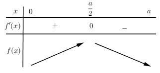 \(\eqalign{ & \Rightarrow {1 \over 3}y\left( {{{{a^2}} \over 2} + {{ax} \over 2}} \right) = {1 \over 6}a\sqrt {{a^2} - {x^2}} \left( {a + x} \right) \cr & f(x) = {1 \over 6}a\sqrt {{a^2} - {x^2}} \left( {a + x} \right);\,\,x \in \left( {0;a} \right) \cr & f'(x) = {1 \over 6}.a.\left[ {{{ - x\left( {a + x} \right)} \over {\sqrt {{a^2} - {x^2}} }} + \sqrt {{a^2} - {x^2}} } \right] = {1 \over 6}.a\left[ {{{ - x\left( {a + x} \right) + {a^2} - {x^2}} \over {\sqrt {{a^2} - {x^2}} }}} \right] = {1 \over 6}a{{ - 2{x^2} - ax + {a^2}} \over {\sqrt {{a^2} - {x^2}} }} \cr & f'(x) = 0 \Leftrightarrow - 2{x^2} - ax + {a^2} = 0 \Rightarrow \left[ \matrix{ x = - a\,\,\left( {ktm} \right) \hfill \cr x = {a \over 2}\,\,\,\,\,\left( {tm} \right) \hfill \cr} \right. \cr} \)