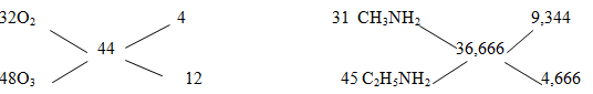 \(\left\{ \matrix{ {O_2}\,\,{{{V_1}} \over 4} \hfill \cr {O_3}{{3{V_1}} \over 4} \hfill \cr} \right.\,\,\,\,\,\,\,\,\,\& \,\,\,\left\{ \matrix{ C{H_3}N{H_2}\,\,{{2{V_2}} \over 3} \hfill \cr {C_2}{H_5}N{H_2}{{{V_2}} \over 3} \hfill \cr} \right.\,\,\, \Leftrightarrow \left\{ \matrix{ C{O_2}\,\,{{4{V_2}} \over 3} \hfill \cr {H_2}O{{17{V_2}} \over 6} \hfill \cr} \right.\)