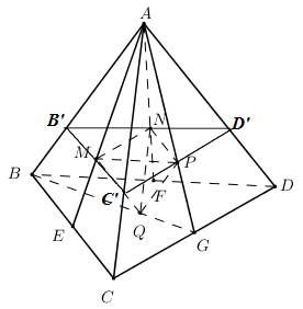 \(\begin{array}{l}\dfrac{{d\left( {Q;\left( {MNP} \right)} \right)}}{{d\left( {A;\left( {MNP} \right)} \right)}} = \dfrac{{QI}}{{AI}} = \dfrac{1}{2};\,\,\dfrac{{d\left( {A;\left( {MNP} \right)} \right)}}{{d\left( {A;\left( {BCD} \right)} \right)}} = \dfrac{{AB'}}{{AB}} = \dfrac{2}{3}\ \Rightarrow \dfrac{{d\left( {Q;\left( {MNP} \right)} \right)}}{{d\left( {A;\left( {BCD} \right)} \right)}} = \dfrac{1}{2}.\dfrac{2}{3} = \dfrac{1}{3}\end{array}\)