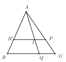 Trong \(\left( {ABG} \right)\) gọi \(I = AQ \cap B'P\). Ta có \(\dfrac{{AB'}}{{AB}} = \dfrac{{AI}}{{AQ}} = \dfrac{{AP}}{{AG}} = \dfrac{2}{3}\).