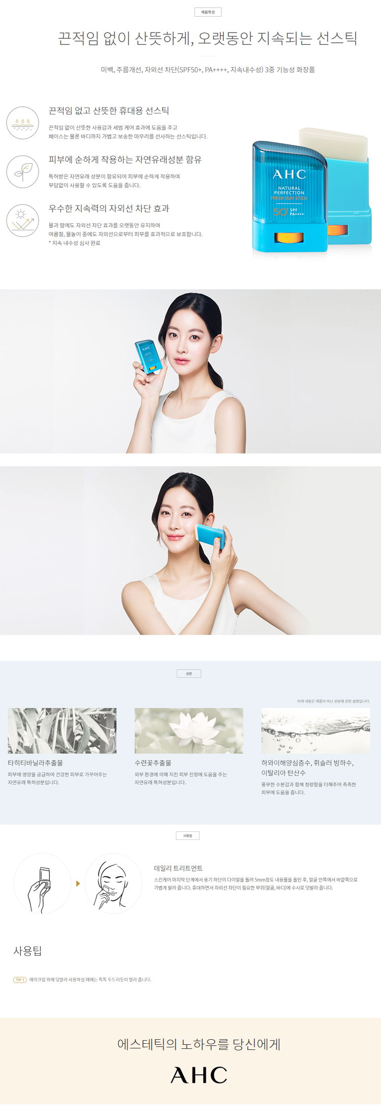 Có thể dùng AHC Natural Perfection Fresh Sun Stick trước hoặc sau khi trang điểm vừa bảo vệ da vừa làm lớp nền sáng trong tự nhiên, giữ lớp trang điểm lâu trôi.