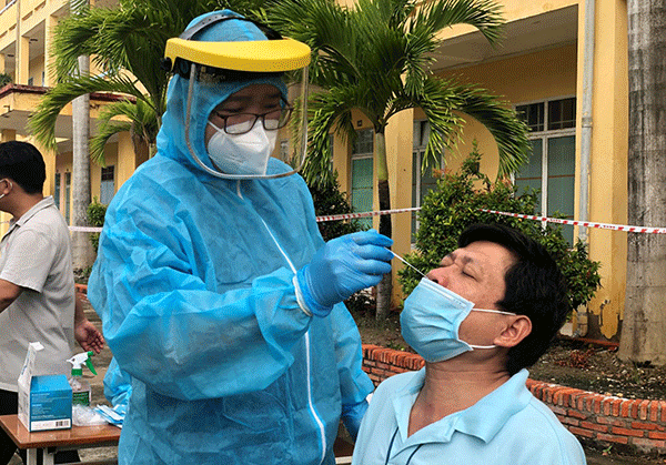 Nhân viên y tế lấy mẫu xét nghiệm nhanh COVID-19 cho các F1 tại khu cách ly tập trung định kỳ 2 ngày 1 lần. Ảnh: DÂN AN
