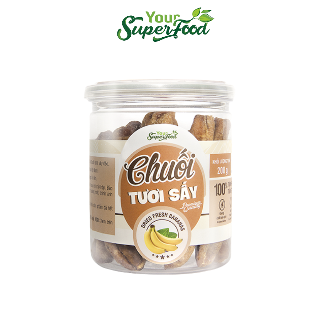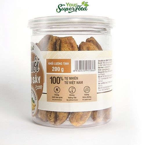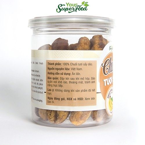 Chuối Sấy Dẻo Your Superfood hoàn toàn có nguồn gốc 100% tự nhiên, không chất bảo quản, không hóa chất, không đường nên có thể để được lâu mà vẫn giữ được hương vị, chất dinh dưỡng và màu sắc đặc trưng. Chuối sấy dẻo thực sự là một món ăn vặt lành mạnh, bạn có thể dùng trực tiếp hay sử dụng làm bánh, hay là một loại topping ăn cùng với sữa chua, yến mạch,...cũng vô cùng thú vị đấy!