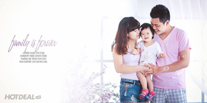 - Chi tiết gói dịch vụ:+ Khách hàng được chụp từ 150 đến 200 kiểu ảnh, in 10 kiểu 13 x 18 tráng UV trong 10 kiểu ảnh có tối đa 2 ảnh bé chụp cùng gia đình(trong gia đình tối đa 5 người chụp cùng)+ Khách được tặng thêm 01 ảnh 15 x 21 tráng UV+ Bé được thay 04 bộ quần áo, 04 bối cục khác nhau+ Hỗ trợ trang phục cho bé từ 3 tháng tuổi đến 5 tuổi. Gói chụp ảnh áp dụng cho bé từ 3 tháng tuổi đến 5 tuổi. Hỗ trợ trang điểm làm tóc miễn phí cho các bé.+ Khách hàng được copy ảnh free size đã được chỉnh sửa. Nếu khách có nhu cầu copy toàn bộ ảnh gốc vui lòng thanh toán thêm 300.000đ