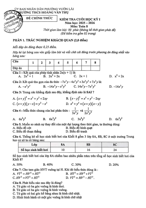 Đề cuối học kỳ 1 Toán 8 năm 2025 – 2026 trường THCS Hoàng Văn Thụ – TP HCM 23/12/2025
