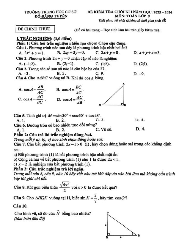 Đề cuối kì 1 Toán 9 năm 2025 – 2026 trường THCS Đỗ Đăng Tuyển – Đà Nẵng 23/12/2025