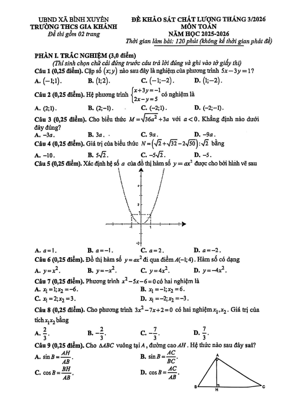 Đề khảo sát Toán 9 tháng 3 năm 2026 trường THCS Gia Khánh – Phú Thọ 08/03/2026