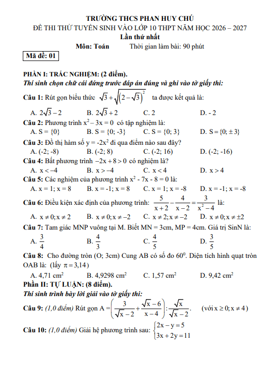 Đề thi thử Toán vào lớp 10 lần 1 năm 2026 – 2027 trường THCS Phan Huy Chú – Hà Tĩnh 08/03/2026