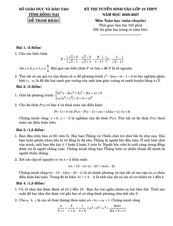 Đề tham khảo tuyển sinh lớp 10 môn Toán (chuyên) năm 2026 – 2027 sở GD&ĐT Đồng Nai 11/02/2026