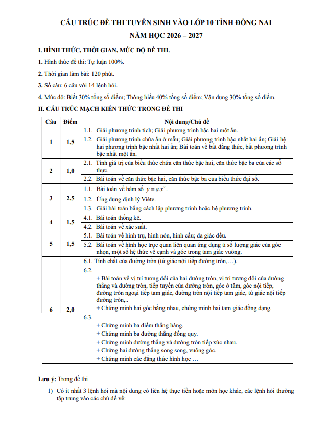 Đề tham khảo tuyển sinh lớp 10 môn Toán năm 2026 – 2027 sở GD&ĐT Đồng Nai 11/02/2026