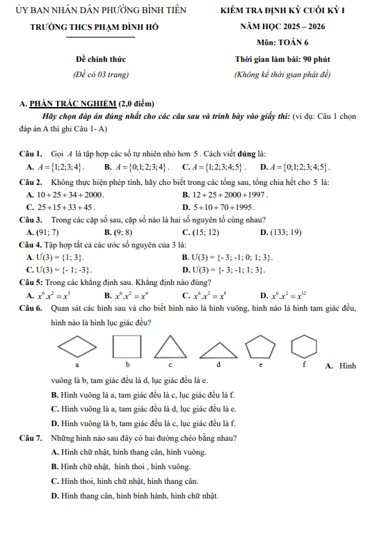 Đề cuối kỳ 1 Toán 6 năm 2025 – 2026 trường THCS Phạm Đình Hổ – TP HCM 10/01/2026