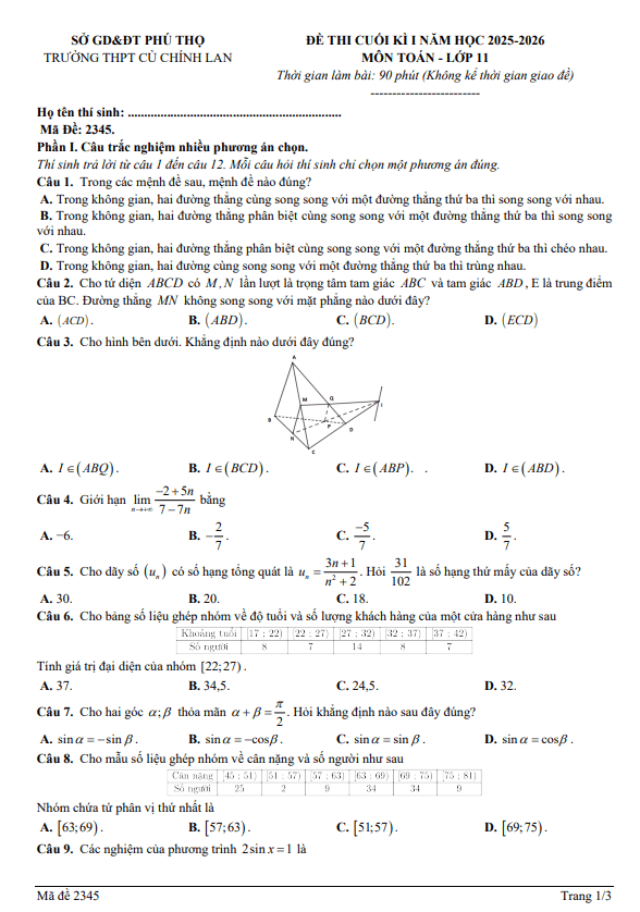 Đề cuối kì 1 Toán 11 năm 2025 – 2026 trường THPT Cù Chính Lan – Phú Thọ 07/01/2026