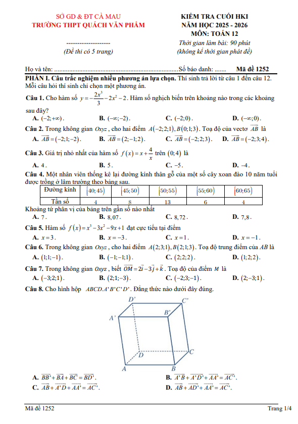 Đề cuối kì 1 Toán 12 năm 2025 – 2026 trường THPT Quách Văn Phẩm – Cà Mau 07/01/2026