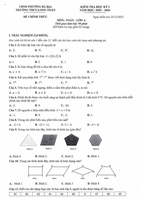 Đề cuối học kì 1 Toán 6 năm 2025 – 2026 trường THCS Long Toàn – TP HCM 09/01/2026