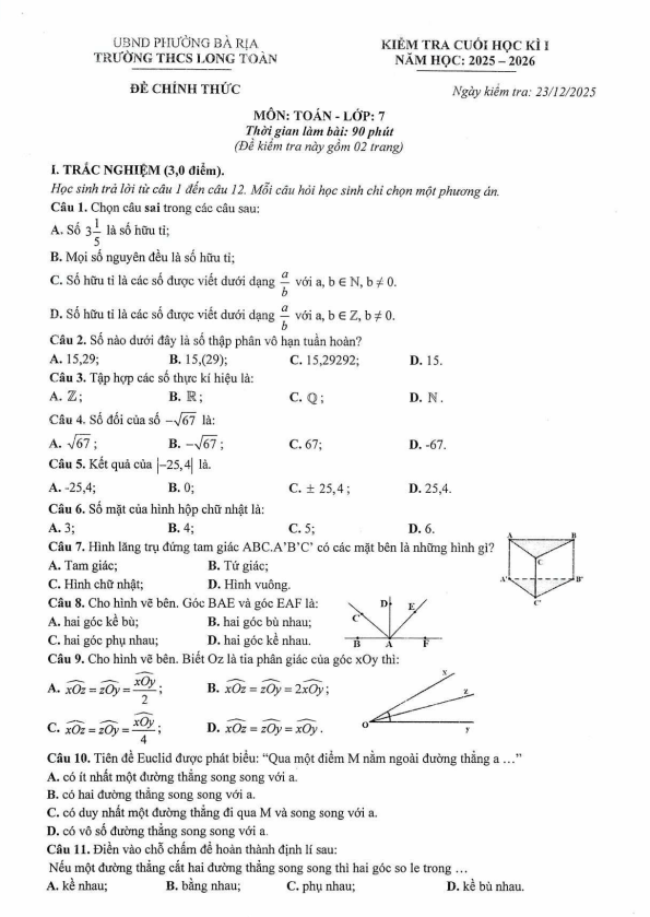 Đề cuối học kì 1 Toán 7 năm 2025 – 2026 trường THCS Long Toàn – TP HCM 09/01/2026