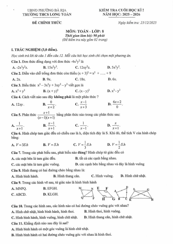 Đề cuối học kì 1 Toán 8 năm 2025 – 2026 trường THCS Long Toàn – TP HCM 09/01/2026