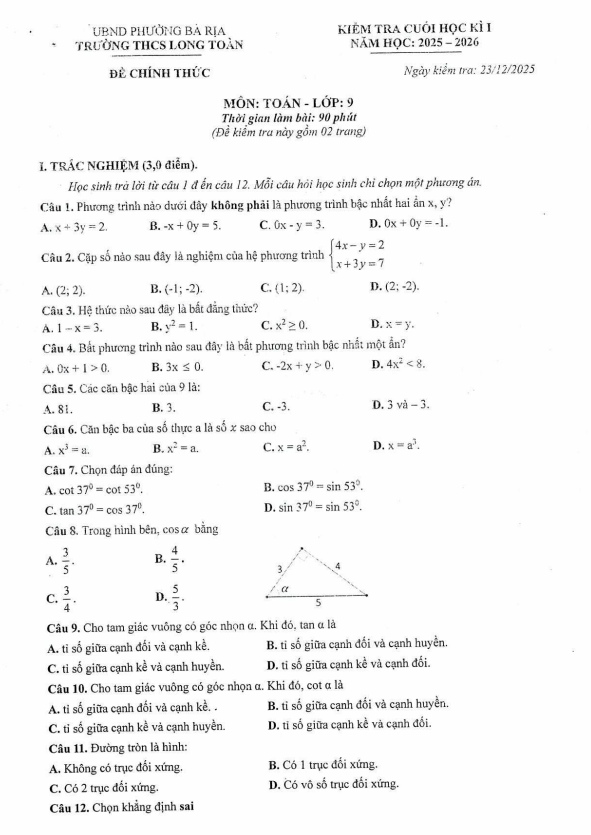 Đề cuối học kì 1 Toán 9 năm 2025 – 2026 trường THCS Long Toàn – TP HCM 09/01/2026