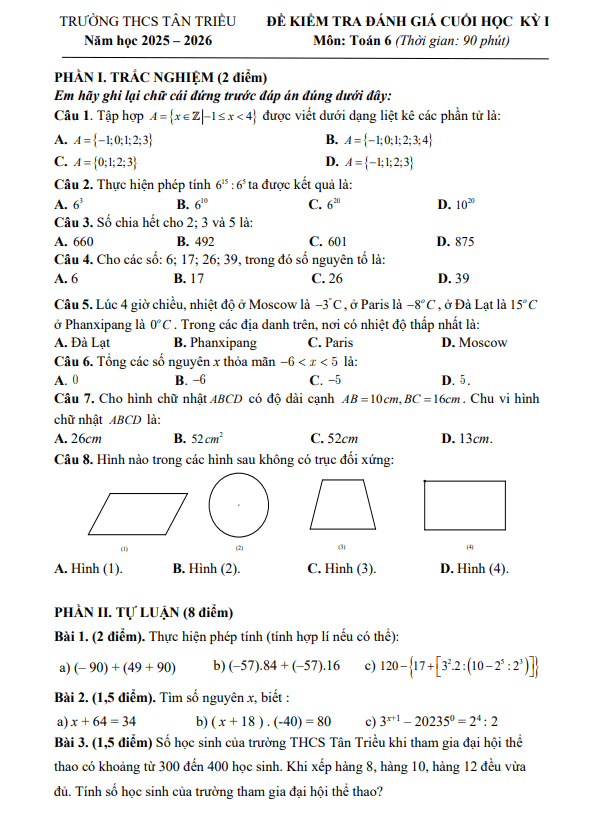 Đề cuối học kỳ 1 Toán 6 năm 2025 – 2026 trường THCS Tân Triều – Hà Nội 09/01/2026