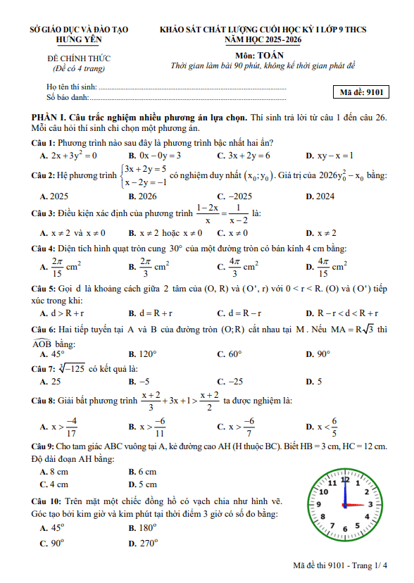 Đề cuối học kỳ 1 Toán 9 năm 2025 – 2026 sở GD&ĐT Hưng Yên 09/01/2026