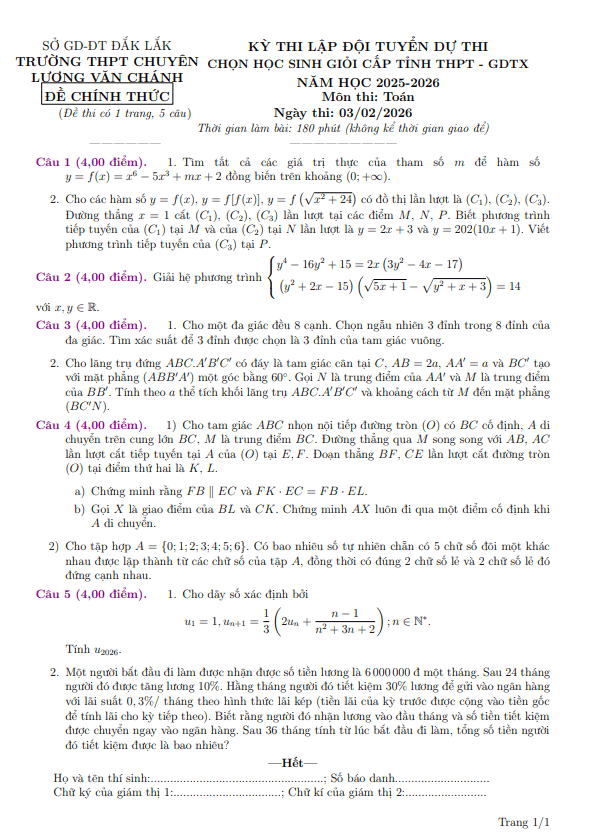 Đề chọn HSG Toán THPT năm 2025 – 2026 trường chuyên Lương Văn Chánh – Đắk Lắk 04/02/2026