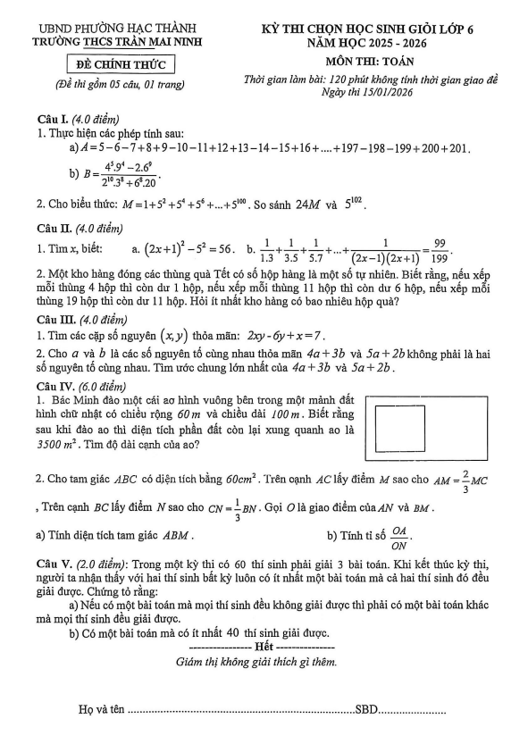 Đề chọn học sinh giỏi Toán 6 năm 2025 – 2026 trường THCS Trần Mai Ninh – Thanh Hóa 21/01/2026