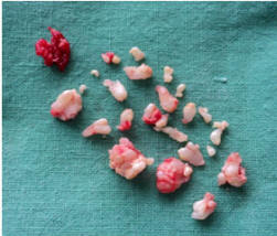 Ca phẫu thuật được thực hiện thuận lợi và các bác sĩ tiến hành lấy trọn khối u. U là một khối màu trắng ngà, rắn, kích thước 3x3x2 cm, gồm nhiều tiểu thể nhỏ kết dính lại với nhau, và được bao bọc bằng một bao xơ dầy dai chắc. Khi chia tách u ra để khảo sát thì một điều hết sức bất ngờ là có tổng cộng đến 54 chiếc răng nhỏ li ti bên trong khối u răng này.