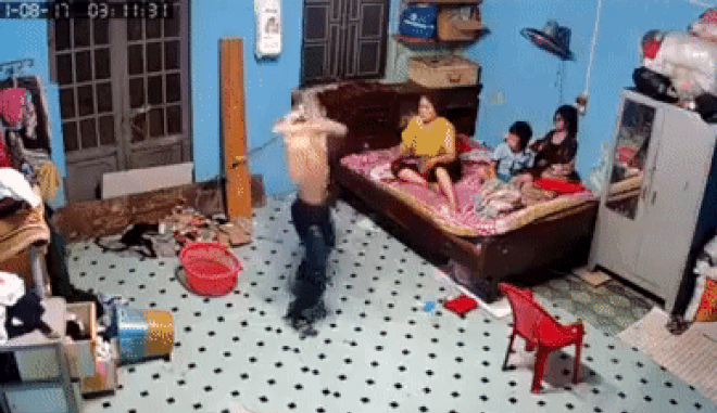 Theo hình ảnh trích xuất từ camera an ninh, sự việc xảy ra vào khoảng 3h ngày 17/8. Lúc này, một nam thanh niên cởi trần đến bên giường đánh thức một người phụ nữ đang nằm cùng 2 bé và nói đòi điện thoại. Người phụ nữ được cho là mẹ của nam thanh niên này.