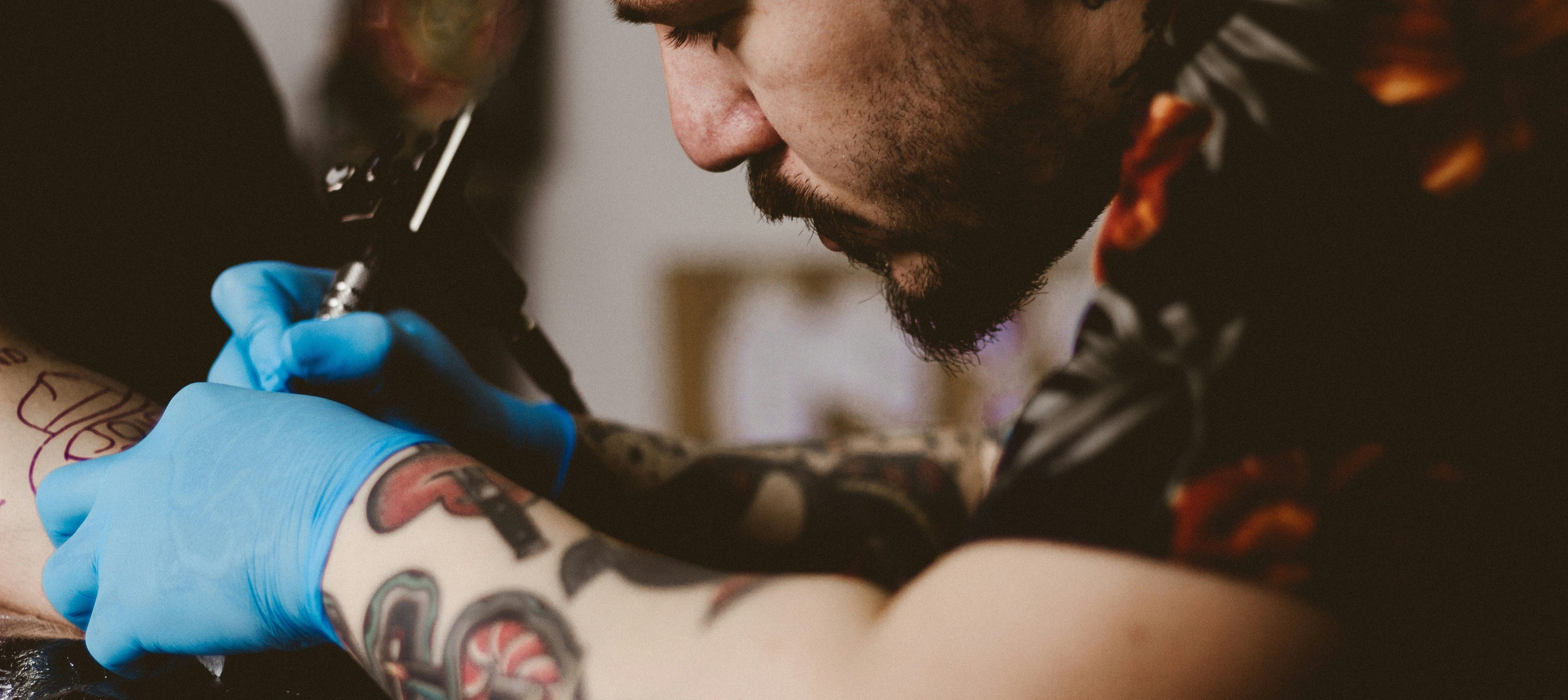 ![Two tattoo machines on a red and black gradient background with CNC Hammer branding.]()