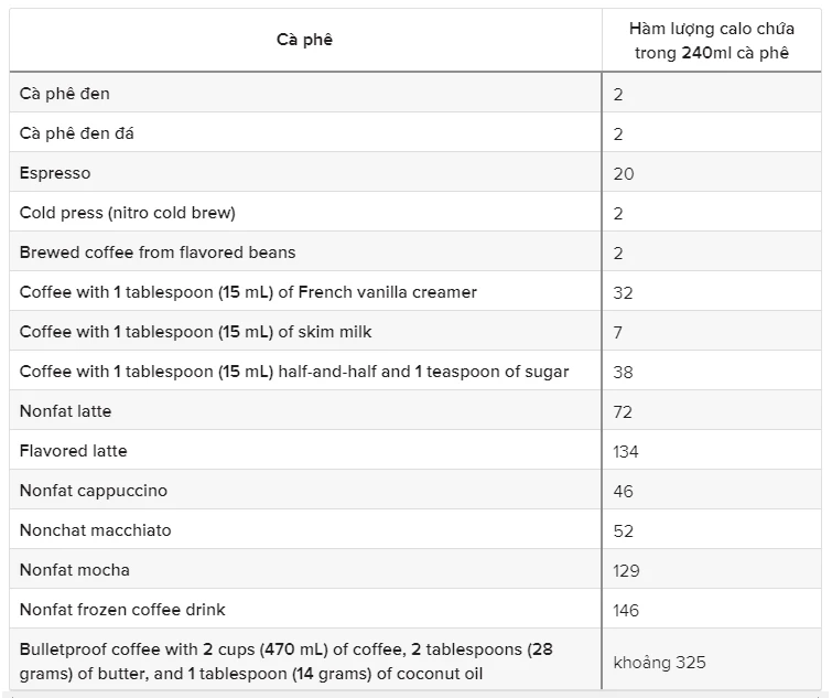Cà phê nguyên chất được pha chế chủ yếu là nước, do đó hầu như không có calo. Tuy nhiên, không phải tất cả đồ uống làm bằng cà phê đều có lượng calo thấp. Bảng dưới đây phác thảo số lượng calo xấp xỉ trong các loại đồ uống cà phê khác nhau: