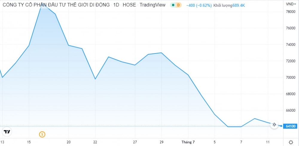 Hiện cổ phiếu MWG đứng ở mức 64.100đ/cp (phiên chiều 12/7). Khối lượng giao dich trung bình phiên đạt hơn 3 triệu đơn vị.