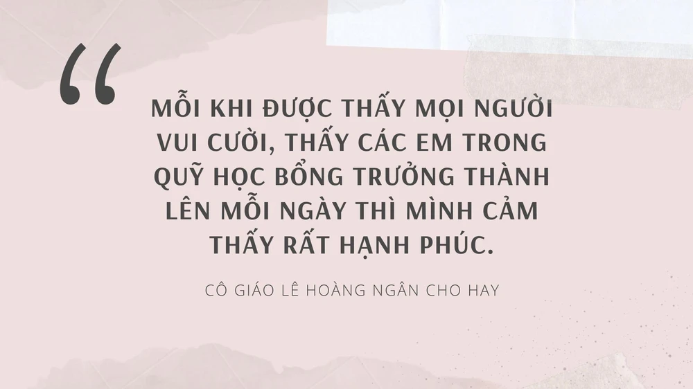 “Đồng hành mới thấy các em rất có nghị lực, hiểu chuyện và biết sẻ chia. Ví như có trường hợp cha mẹ mất sớm vì ung thư, ba chị em sống với bà nội, trong đó người con đầu thi đậu đại học ở TP.HCM, con trai thứ đi học nghề. Mình rất muốn làm sao để cả ba em sau này có cuộc sống ổn định hơn nên đề nghị hỗ trợ hai em. Nhưng hai em lớn xin phép chỉ nhận một suất cho bé út và bảo mình dành phần còn lại cho bạn khác khó khăn hơn”- chị Ngân kể.