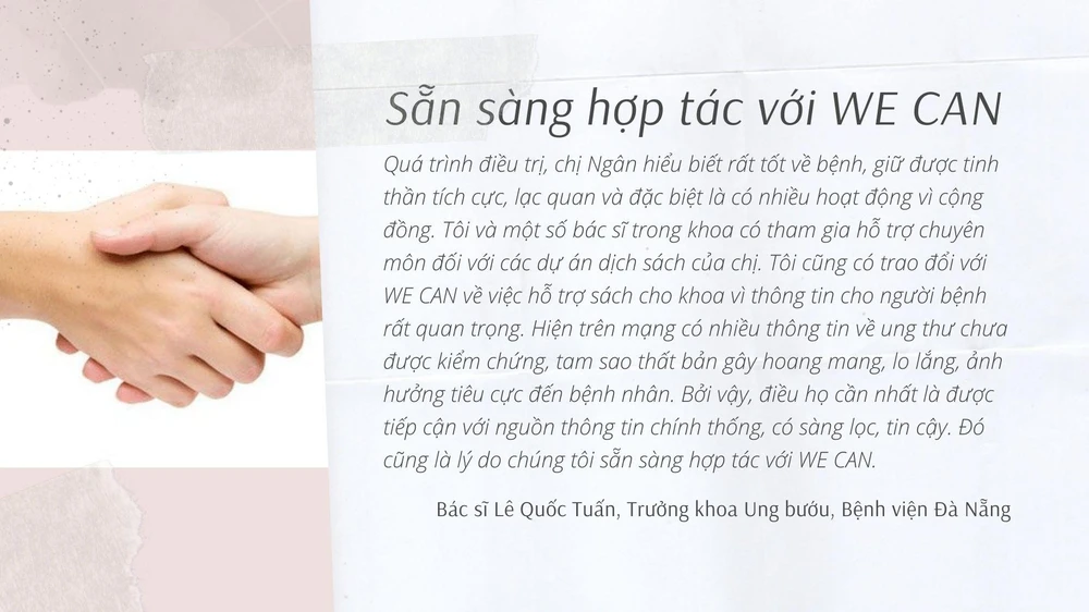 “Điều WE CAN mang đến cho bệnh nhân là sự tử tế, tình người bao la giữa con người với con người. Trong mỗi dự án mà chúng mình thực hiện, những điều này bao giờ cũng được đặt lên hàng đầu, nó chứa đựng trong từng câu nói, ánh mắt, thông điệp chuyển tải để mọi người có sự chia sẻ, gắn kết với nhau. Mình biết sau khi mỗi dự án có thể các chị sẽ lại điều trị hóa chất, lại mệt mỏi nhưng ít ra họ đã có những giây phút vui vẻ, yêu đời. Mỗi khi được thấy mọi người vui cười, thấy các em trong quỹ học bổng trưởng thành lên mỗi ngày thì mình cảm thấy rất hạnh phúc”- chị Ngân cho hay.