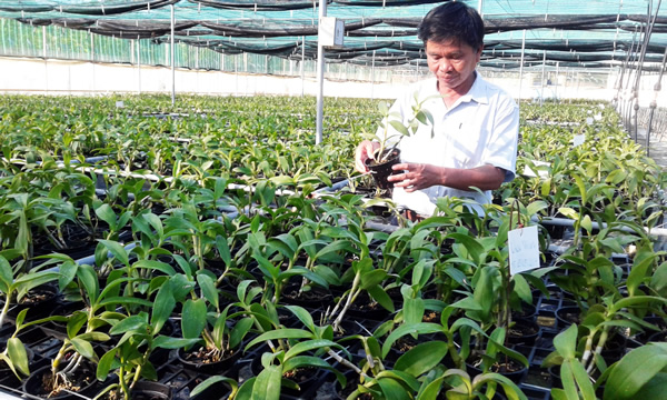 | Kỹ sư Trương Vy đang chăm sóc hoa lan. |