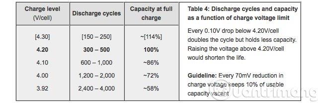 Viên pin sẽ không thể bị sạc quá mức. Khi bạn cắm sạc liên tục vào pin sẽ không gây nguy hiểm gì bởi khi đầy 100% dung lượng, pin sẽ tự động ngắt và không nhận thêm điện nữa trừ trường hợp năng lượng xuống dưới mức nhất định. Trái lại, với công nghệ pin hiện nay, việc sử dụng đến cạn pin rồi mới sạc sẽ gây hại cho pin cũng như dẫn đến tình trạng không thể khôi phục lại dung lượng. Như vậy, theo lý thuyết, việc cắm sạc liên tục cho laptop chẳng gây hại gì. Tuy nhiên, vấn đề không đơn giản như vậy. Các yếu tố gây hại cho pin Lithium Có 1 sự thật về loại pin này là chúng hoạt động không ổn định. Pin Lithium đã bắt đầu bị mất dung lượng ngay từ khi chúng được sản xuất và có rất nhiều yếu tố đẩy nhanh quá trình này bao gồm: Trong số 3 yếu tố nói trên thì nhiệt độ và điện áp có thể gây ảnh hưởng nhiều nhất cho viên pin. Mức độ gây hại thậm chí sẽ còn lớn hơn nếu 2 yếu tố này kết hợp lại với nhau. Điện áp Dưới đây là thống kê về ảnh hưởng của điện áp đối với pin Lithium-ion. Ở mức điện áp 4m2 V/cell, pin sẽ có số chu kỳ sạc từ 300 đến 500 lần và đạt dung lượng 100%. Khi lượng điện áp giảm dần trong quá trình sử dụng (số chu kỳ sạc tăng lên) thì dung lượng pin cũng theo đó mà giảm đi. Ở mức điện áp 3,92 V/cell tương đương 2.400 đến 4.000 chu kỳ sạc, dung lượng pin chỉ còn 58%. Đồng nghĩa rằng bạn sẽ chỉ còn sử dụng được thiết bị của mình trong 1 nửa thời gian so với trước với 1 lần sạc đầy.