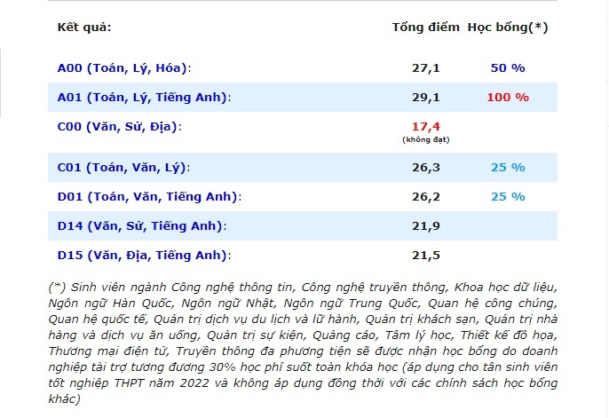 Kết quả tổng điểm và mức học bổng tương ứng (nếu có) của thí sinh khi sử dụng phần mềm tra cứu Bước 4: Sau khi có điểm các tổ hợp môn, thí sinh tiếp tục tham khảo thông tin các tổ hợp môn xét tuyển vào các ngành tại UEF bằng cách click vào từng tổ hợp. Lúc này link bài viết tương ứng sẽ xuất hiện để các bạn tìm hiểu chi tiết. Ví dụ khi click vào D14 (Văn - Sử - Tiếng Anh), bạn sẽ thấy xuất hiện giao diện bài viết này: