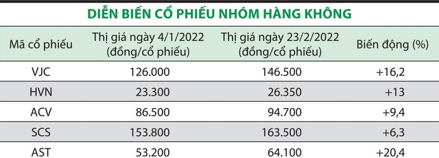 Trên thị trường chứng khoán, nhiều cổ phiếu hàng không đã tăng mạnh mẽ trong thời gian qua như VJC ngày 23/2 có thị giá 146.500 đồng/cổ phiếu, tăng 16,2% so với đầu tháng 1. Cùng thời gian này, cổ phiếu SCS có thị giá 163.500 đồng/cổ phiếu, tăng 6,3%; cổ phiếu HVN thị giá 26.350 đồng/cổ phiếu, ACV đạt thị giá 94.700 đồng/cổ phiếu, tăng 9,4%; AST thị giá 64.100 đồng/cổ phiếu, tăng 20,4%.