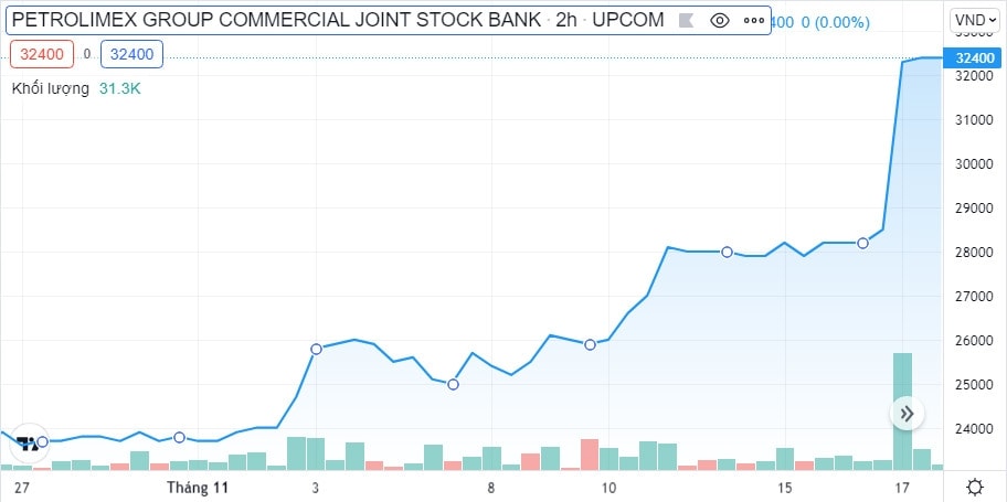 Phiên giao dịch 17/11, cổ phiếu PGB của Ngân hàng TMCP Xăng Dầu Petrolimex (PG Bank) đã tăng kịch trần lên 32.400 đồng/cp, qua đó vượt mốc đỉnh lịch sử cũ hồi đầu tháng 6. Thanh khoản của cổ phiếu này cũng chứng kiến sự bùng nổ với khối lượng giao dịch đạt hơn 1,77 triệu đơn vị, cao nhất trong gần nửa năm trở lại, tương đương với giá trị giao dịch là hơn 55,6 tỷ đồng.