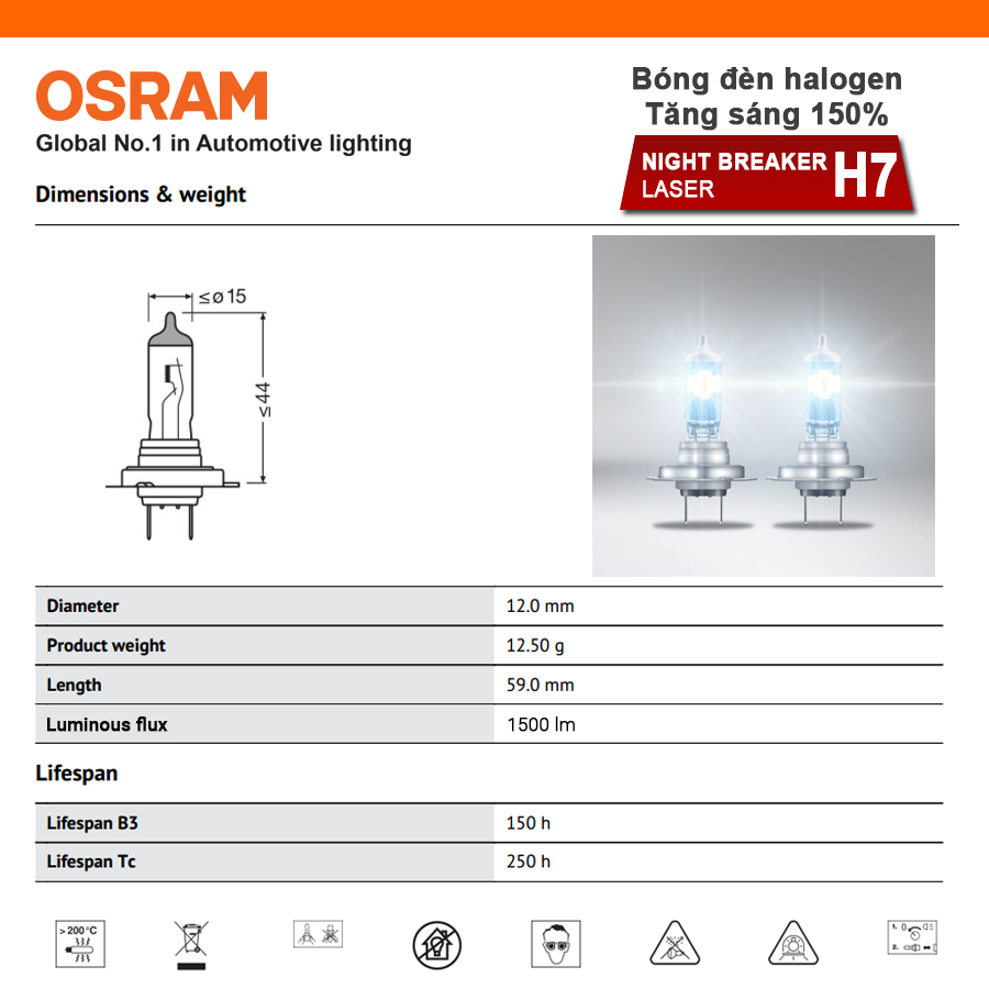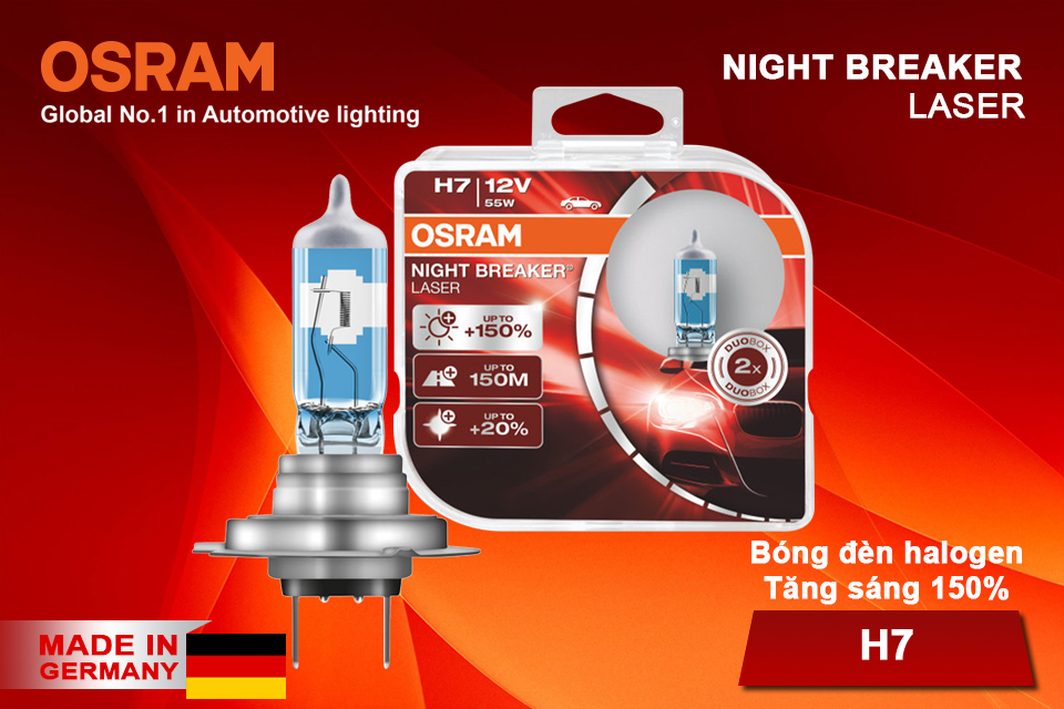 - Bóng đèn halogen tăng sáng 150% OSRAM NIGHT BREAKER LASER H7 12v 55w được chế tạo bằng thủy tinh cao cấp, được sản xuất và kiểm tra bằng quy trình nghiêm ngặt nhất.