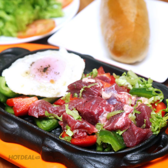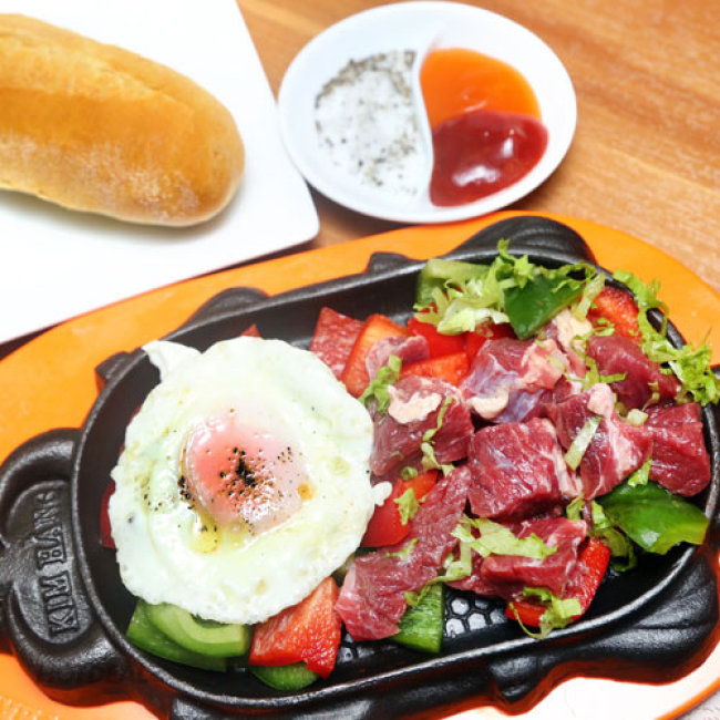 - Định lượng 01 phần Bò Trùm Mền: Philê Bò Mỹ 100gr; 01 trứng ốp la; 01 ổ bánh mì.