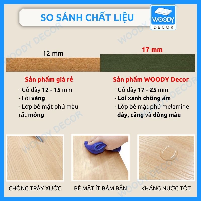 - Chất liệu: Gỗ HMR (MDF lõi xanh kháng ẩm) đặc mịn phủ melamine, chống cong vênh, mối mọt; có khả năng chống trầy xước, chịu nhiệt tốt và dễ dàng vệ sinh. Gỗ dày 1,7cm.