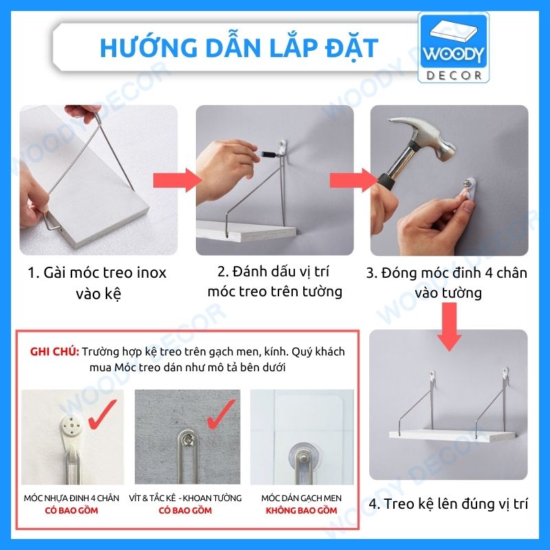 - Kệ gỗ treo tường có thể chịu lực trên 5kg. Nếu muốn để đồ nặng hơn, quý khách có thể khoan tường và sử dụng bộ vít + tắc kê tặng kèm hoặc đặt mua kệ gỗ của WOODY Decor với kết cấu giấu chân âm kệ cho khả năng chịu lực trên 20kg
