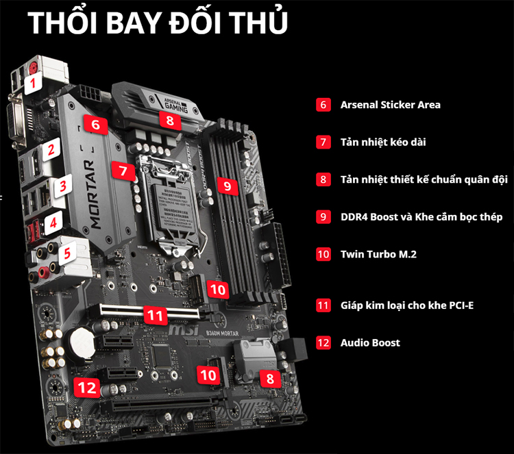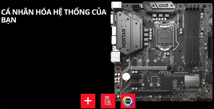 Mainboard MSI B360 Mortar đóng vai trò là một bản mạch trung gian giao tiếp giữa các thiết bị với nhau. Thiết bị là mạch điện chính của một hệ thống hay thiết bị điện tử (ví dụ như nguồn máy tính, CPU, bo mạch đồ họa, bo mạch âm thanh, bo mạch mạng, ổ cứng, màn hình, máy in, máy quét,…) bằng cách trực tiếp trên bề mặt thiết bị đó hoặc thông qua các kết nối cắm vào hoặc dây dẫn liên kết.